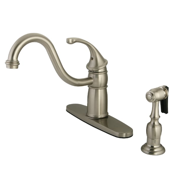 The whimsical design of this faucet is intended to catch eyes. Easily adaptable to any kitchen, the Georgian 8-Inch Centerset Kitchen Faucet with Brass Sprayer is prized for its easy-to-use single handle. This makes it the perfect fixture for multitasking as you can adjust temperature and volume in one swipe. Enjoy the strong and durable brass material and brushed nickel finish that will last for years to come. Utilize the included side-sprayer for convenience in cleaning hard-to-reach areas.