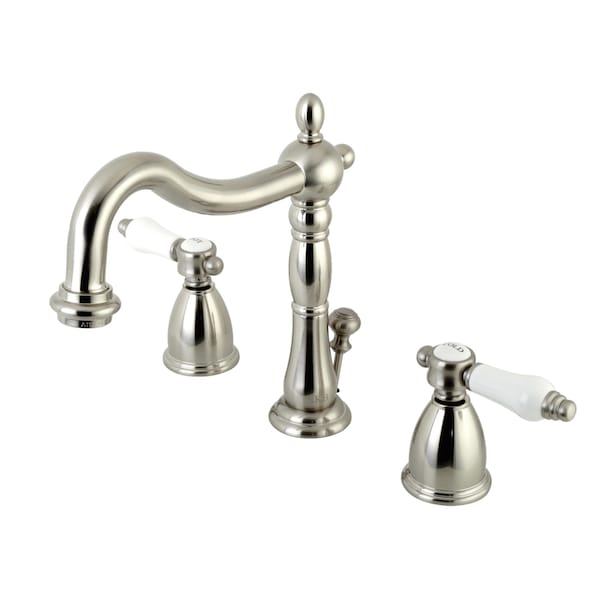 The graceful elegance of timeless design is beautifully merged between British flair and Victorian delicacy within this faucet's white porcelain levers. Ideal for more spacious bathrooms, widespread faucets are more spread apart and feature a 3-hole installation. The Bel-Air 8" Widespread Bathroom Faucet with Retail Pop-Up and its sturdy brass construction and premium brushed nickel finish are guaranteed to glamorize your home. A matching finish drain is also included.