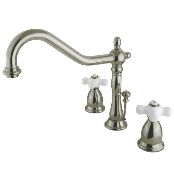 A lavish spark of traditionally stylized glamour is brought to your bathroom ensemble with this beautiful faucet. Ideal for more spacious bathrooms, widespread faucets are more spread apart and feature a 3-hole installation. The Heritage 8-Inch Widespread Bathroom Faucet with Brass Pop-Up and its sturdy brass construction and premium brushed nickel finish are guaranteed to glamorize your home. A matching finish drain is also included.