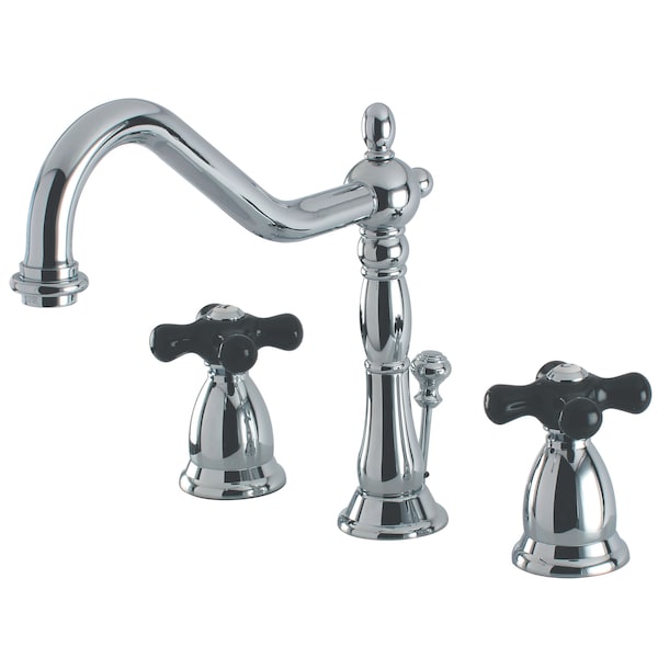 Crafted in commendations to English nobility, the exemplary design of this faucet manifests regality and elegance with its black porcelain handles. Ideal for more spacious bathrooms, widespread faucets are more spread apart and feature a 3-hole installation. The Duchess 8-Inch Widespread Bathroom Faucet with Brass Pop-Up and its sturdy brass construction and premium polished chrome finish are guaranteed to glamorize your home. A matching finish drain is also included.