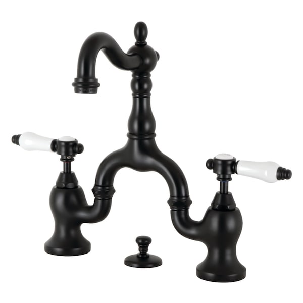 The graceful elegance of timeless design is beautifully merged between British flair and Victorian delicacy within this faucet's white porcelain levers Elegantly designed, the exquisite arch connecting the spout to the handles provides an added aesthetic appeal to make for more of a statement piece Additionally, the 8116 inch of spout clearance make for a very easy hand washing experience with plenty of room for other tasks The BelAir bridge bathroom faucet and its featured sturdy brass construction and premium matte black finish will glamorize your home's traditional ensemble for years to come Varnish your bathroom with this stateoftheart fixture A matching finish drain is also included