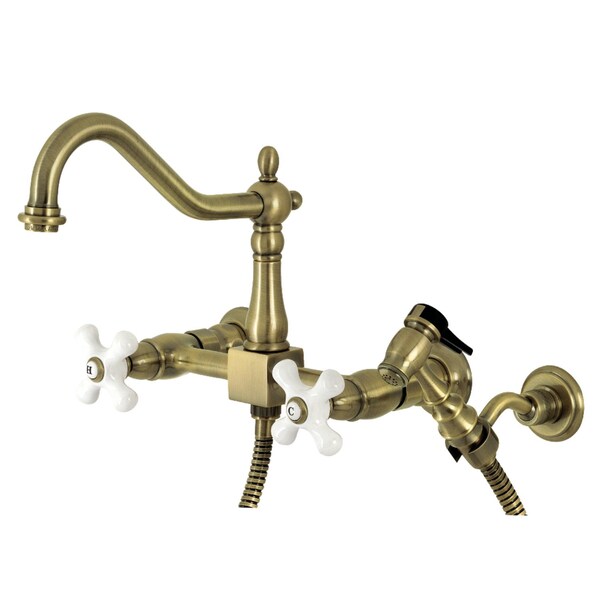 Heritage 2-Handle Wall Mnt Bridge Kitchen Faucet W/Brass Sprayer, Brass