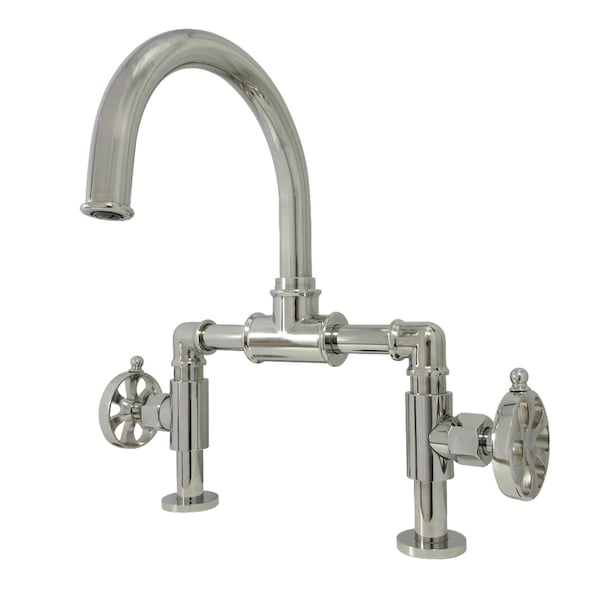 Indstrl Style Wheel Handle Bridge Bathroom Faucet W/Pop-Up Drain, Nkl