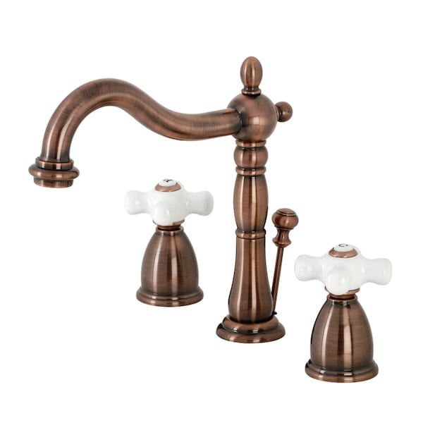 A lavish spark of traditionally stylized glamour is brought to your bathroom ensemble with this beautiful faucet. Ideal for more spacious bathrooms, widespread faucets are more spread apart and feature a 3-hole installation. The Heritage widespread bathroom faucet with brass pop-up and its featured sturdy brass construction and premium antique copper finish are guaranteed to glamorize your home's traditional ensemble for years to come. Celebrate sophistication and traditional decor with this statement piece. A matching finish drain is also included.