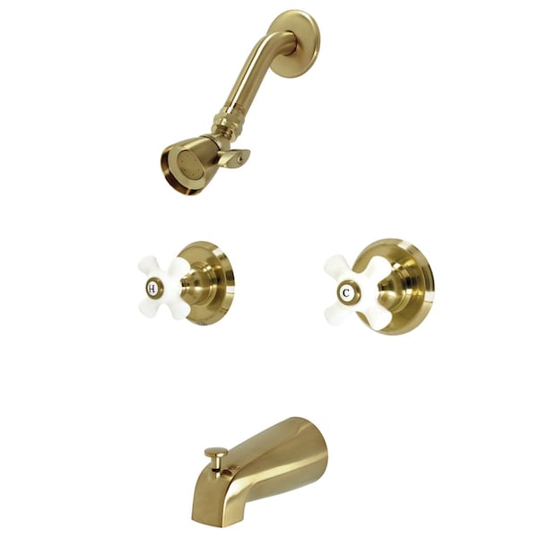 The timeless appeal of this tub and shower faucet's sleek and simple design transforms any bathroom into a destination location. Complete with easy-to-turn cross handles, an optimum bathing experience awaits. Enjoy the sturdy brass construction and premium brushed brass finish for a fixture that will last for years to come. Internal valve hardware is included for your use.