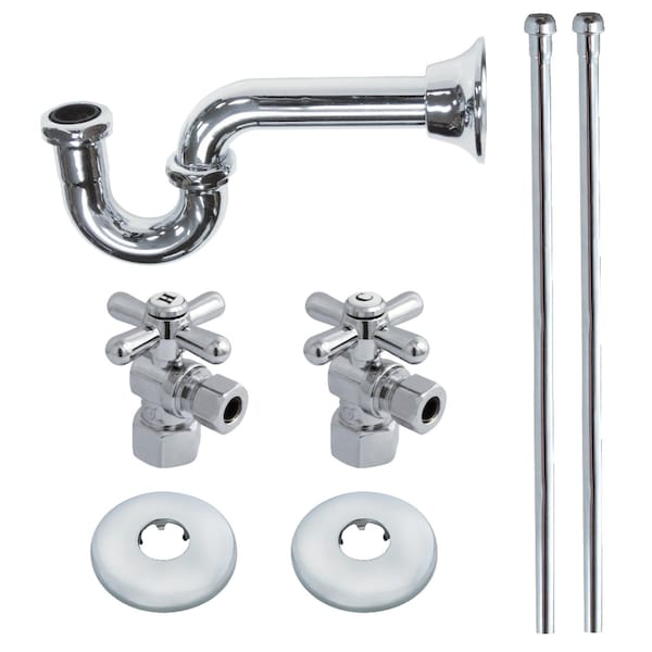 This 7-piece plumbing supply kit from Kingston Brass provides all the necessary parts in the water flow process for your bathroom sink. The set includes two 1/4 turn hardisc angle stops with cross handles, two 30" bullnose supply line, two traditional decorative flanges and a traditional 1-1/4" OD Decorative P-trap. Each of these parts are finished with polished chrome and are constructed in solid brass for durability and reliability.