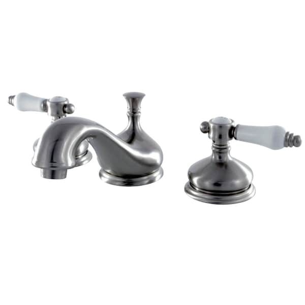 The graceful elegance of timeless design is beautifully merged between British flair and Victorian delicacy within this faucet's white porcelain levers. Ideal for more spacious bathrooms, widespread faucets are more spread apart and feature a 3-hole installation. The Bel-Air 8-inch widespread bathroom faucet with brass pop-up and its featured sturdy brass construction and premium brushed nickel finish are guaranteed to glamorize your home's traditional ensemble for years to come. Varnish your bathroom with this state-of-the-art fixture. A matching finish drain is also included.