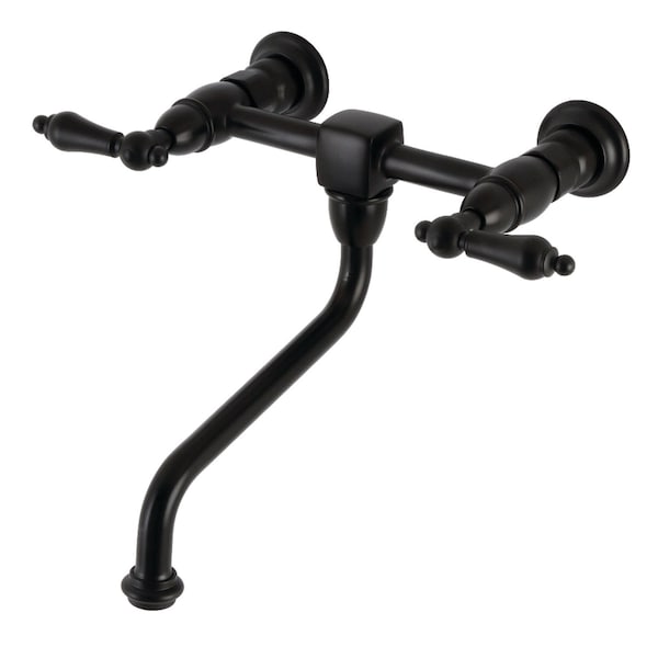 A lavish spark of traditionally stylized glamour is brought to your bathroom ensemble with this beautiful faucet. Attached to the wall behind your sink, the horizontal pop adds a stunning element to your bathroom design. Clean-up is also made a breeze as counter space is cleared up. The Heritage two handle two handle wall mount bathroom faucet and its featured sturdy brass construction and premium matte black finish are guaranteed to glamorize your home's traditional ensemble for years to come. Celebrate sophistication and traditional decor with this statement piece.