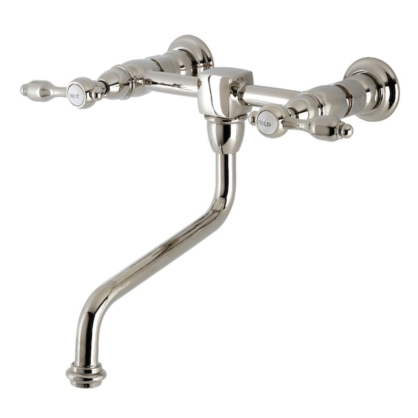 Offering a nod toward the past, this faucet is beautifully inspired by the vintage elegance of mid-19th Century design. Attached to the wall behind your sink, the horizontal pop adds a stunning element to your bathroom design. Clean-up is also made a breeze as counter space is cleared up. The Tudor two handle wall mount bathroom faucet and its featured sturdy brass construction and premium polished nickel finish are guaranteed to glamorize your home's traditional ensemble for years to come. A unique and classically enchanting personality is embodied in this centerpiece.