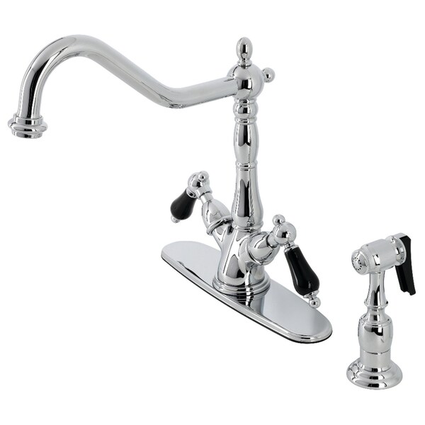 Crafted in commendations to English nobility, the exemplary design of this faucet manifests regality and elegance with its black porcelain handles. For a streamlined yet glamorous look, two-handle single-hole kitchen faucets are a practical and fashionable design. Additionally, the polished chrome finish is guaranteed to embellish your home's traditional ensemble for years to come as it adds a glistening elegance. Allow the brass construction to provide a sturdy and reliant fixture. Utilize the included matching finish side-sprayer for convenience in cleaning hard-to-reach areas.