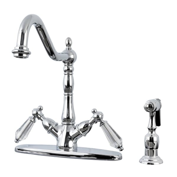 English historical splendor finds itself standing with stunning dignity in the prevalence of the refined acrylic lever handles of this faucet. For a streamlined yet glamorous look, two-handle single-hole kitchen faucets are a practical and fashionable design. Additionally, the polished chrome finish is guaranteed to embellish your home's traditional ensemble for years to come as it adds a glistening elegance. Allow the brass construction to provide a sturdy and reliant fixture. Utilize the included matching finish side-sprayer for convenience in cleaning hard-to-reach areas.