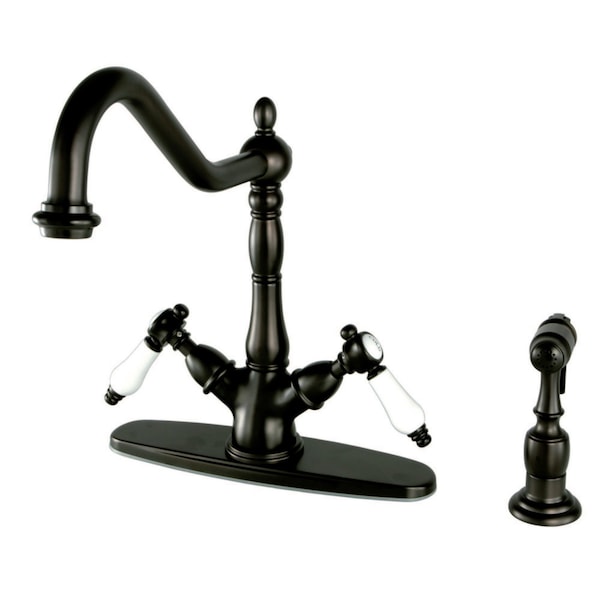 The graceful elegance of timeless design is beautifully merged between British flair and Victorian delicacy within this faucet's white porcelain levers. For a streamlined yet glamorous look, two-handle single-hole kitchen faucets are a practical and fashionable design. Additionally, the oil rubbed bronze finish is guaranteed to embellish your home's traditional ensemble for years to come as it adds a warmer tone. Allow the brass construction to provide a sturdy and reliant fixture. Utilize the included matching finish side-sprayer for convenience in cleaning hard-to-reach areas.