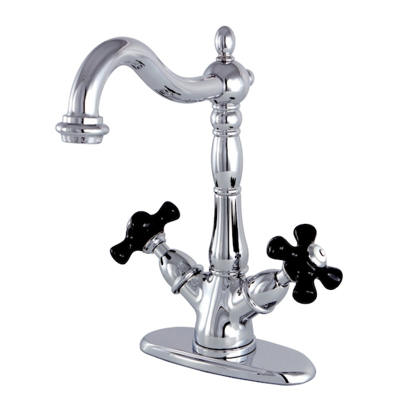 Crafted in commendations to English nobility, the exemplary design of this faucet manifests regality and elegance with its black porcelain handles. Kingston Brass vessel sink faucets perfectly complement the exquisite artistry of vessel sinks. Designed to handle the extra clearance needed for pairing with a vessel sink, this faucet boasts 8-1/4 inch of spout clearance. The Duchess Vessel Sink Faucet and its featured sturdy brass construction and premium polished chrome finish are guaranteed to glamorize your home's traditional ensemble for years to come. Glamorize your home today with the traditional elegance of this faucet.