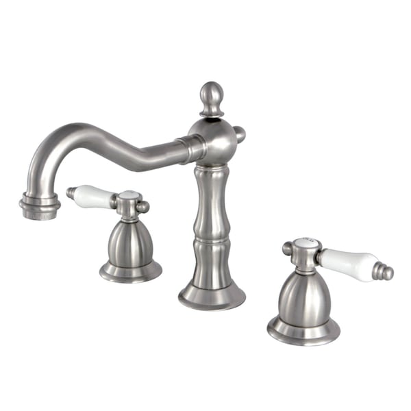 The graceful elegance of timeless design is beautifully merged between British flair and Victorian delicacy within this faucet's white porcelain levers. Ideal for more spacious bathrooms, widespread faucets are more spread apart and feature a 3-hole installation. The Bel-Air 8-inch widespread bathroom faucet with brass pop-up and its featured sturdy brass construction and premium brushed nickel finish are guaranteed to glamorize your home's traditional ensemble for years to come. Varnish your bathroom with this state-of-the-art fixture. A matching finish drain is also included.