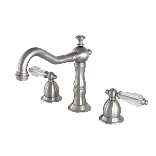 English historical splendor finds itself standing with stunning dignity in the prevalence of the refined acrylic lever handles of this faucet. Ideal for more spacious bathrooms, widespread faucets are more spread apart and feature a 3-hole installation. The Wilshire 8-inch widespread bathroom faucet with brass pop-up and its featured sturdy brass construction and premium brushed nickel finish are guaranteed to glamorize your home's traditional ensemble for years to come. Inspire an atmosphere of classical grandeur with the unique appeal of timeless designs with this statement piece. A matching finish drain is also included.