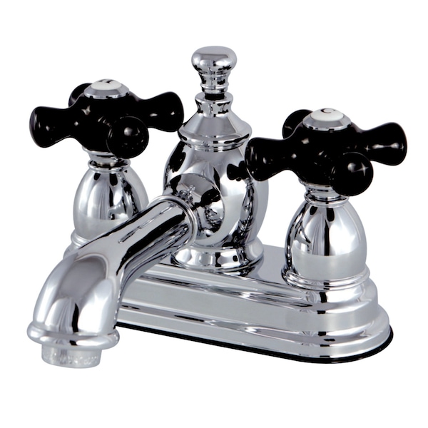 Crafted in commendations to English nobility, the exemplary design of this faucet manifests regality and elegance with its black porcelain handles. Centerset bathroom faucets are ideal for smaller bathrooms and feature an easy 3-hole installation. The Duchess 4-inch centerset bathroom faucet with brass pop-up and its featured sturdy brass construction and premium polished chrome finish are guaranteed to glamorize your home's traditional ensemble for years to come. Glamorize your home today with the traditional elegance of this faucet. A matching finish drain is also included.