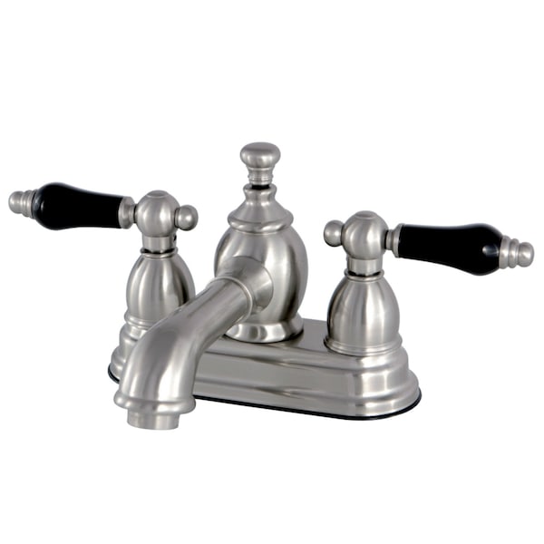 Crafted in commendations to English nobility, the exemplary design of this faucet manifests regality and elegance with its black porcelain handles. Centerset bathroom faucets are ideal for smaller bathrooms and feature an easy 3-hole installation. The Duchess 4-inch centerset bathroom faucet with brass pop-up and its featured sturdy brass construction and premium brushed nickel finish are guaranteed to glamorize your home's traditional ensemble for years to come. Glamorize your home today with the traditional elegance of this faucet. A matching finish drain is also included.