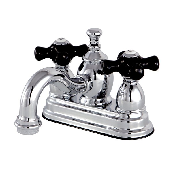 Crafted in commendations to English nobility, the exemplary design of this faucet manifests regality and elegance with its black porcelain handles. Centerset bathroom faucets are ideal for smaller bathrooms and feature an easy 3-hole installation. The Duchess 4-inch centerset bathroom faucet with brass pop-up and its featured sturdy brass construction and premium polished chrome finish are guaranteed to glamorize your home's traditional ensemble for years to come. Glamorize your home today with the traditional elegance of this faucet. A matching finish drain is also included.