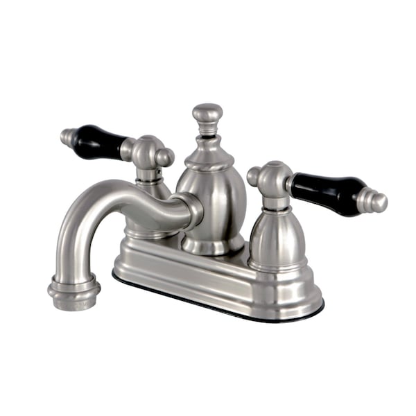 Crafted in commendations to English nobility, the exemplary design of this faucet manifests regality and elegance with its black porcelain handles. Centerset bathroom faucets are ideal for smaller bathrooms and feature an easy 3-hole installation. The Duchess 4-inch centerset bathroom faucet with brass pop-up and its featured sturdy brass construction and premium brushed nickel finish are guaranteed to glamorize your home's traditional ensemble for years to come. Glamorize your home today with the traditional elegance of this faucet. A matching finish drain is also included.