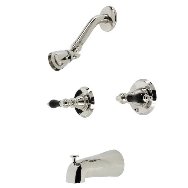 Crafted in commendation to English nobility, the simplistic design yet subtle details of this tub and shower faucet will upgrade your bathroom space. The black porcelain features subtly manifest regality and elegance. Complete with easy-to-turn lever handles, an optimum bathing experience awaits. Enjoy the sturdy brass construction and premium polished nickel finish for a fixture that will last for years to come. Internal valve hardware is included for your use.