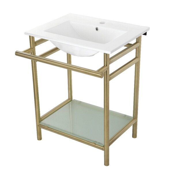 With a beautiful ceramic counter top, this console sink set is a long lasting, durable, and elegant addition to your bathroom. A fabulous alternative where space is limited or tight, making them friendly for the whole family. The pristine, stain-resistant surface and glistening finish make for a very sturdy fixture that is easily maintained. Also for your convenience, anti-slip rubber pads are included with the stainless steel legs to ensure steadiness. Additionally, this console sink includes tempered glass storage shelf and 24" front towel bar. Water supply kit, drain assembly, and the faucet are sold separately.