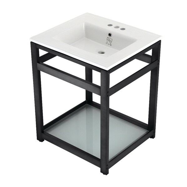 Exquisitely styled for your contemporary taste, this console sink will enhance your bathroom living space. With a beautiful ceramic counter top, this console sink set is a long lasting, durable, and elegant addition to your bathroom. The Kingston Brass 25-inch ceramic console sink (4-inch, 3-hole) features a wash basin and steel base that is available in a handful of finish options. Their pristine, stain-resistant surface and glistening finish make for a very sturdy fixture that is easily maintained. Additionally, this sink base comes with a glass shelf for added functionality and aesthetic appeal. Water supply kit, drain assembly, and the faucet are sold separately.