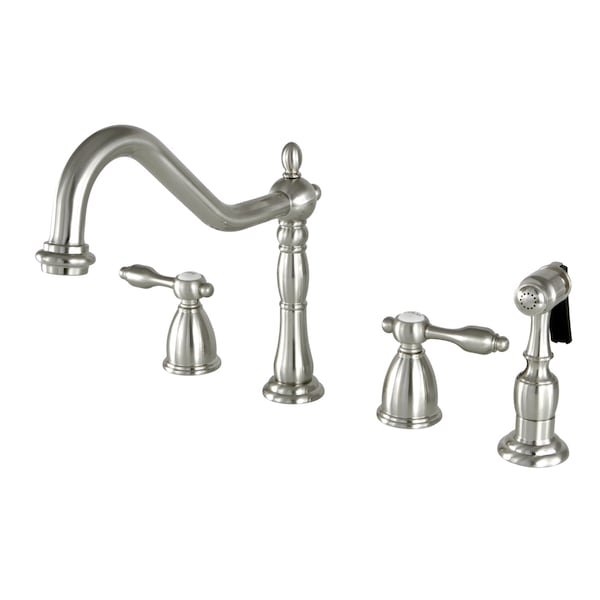 Offering a nod toward the past, this faucet is beautifully inspired by the vintage elegance of mid-19th Century design. Able to fit a variety of sink set-ups, widespread kitchen faucets can be utilized in several multi-hole configurations. These are ideal for larger kitchens, as they are more spread apart, and with the included side-sprayer feature a 4-hole installation. The brushed nickel finish will also provide a long lasting and warm touch to your kitchen ensemble.