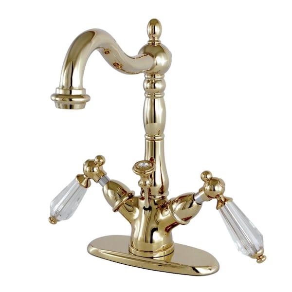 English historical splendor finds itself standing with stunning dignity in the prevalence of the refined acrylic lever handles of this faucet. Single-hole bathroom faucets with optional deck plates are ideal for smaller bathrooms and feature an easy 1 or 3-hole installation. Remove the deck plate for an ease of cleaning and more streamlined design. The Wilshire two-handle bathroom faucet with brass pop-up and cover plate and its featured sturdy brass construction and premium polished brass finish are guaranteed to glamorize your home's traditional ensemble for years to come. Inspire an atmosphere of classical grandeur with the unique appeal of timeless designs with this statement piece. A matching finish drain is also included.