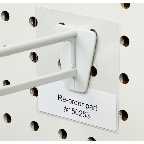 Rectangular style adhesive label/tag holder that is ideal for displaying product re-order information. Clear flexible holder that allows re-stock product information to be easily viewed behind merchandise on both pegboard and slatwall. This economical chip has staggered top holes that accept common plastic or metal two prong back plates found on peg hooks. Two sets of holes at 3/4 inch apart allow for placement at different heights directly behind peg hook back plates. Holes are 1/4 inch diameter each at 1 inch on center. Die-cut production guarantees consistent size. For use with adhesive labels 0.010 inch (10 mil) thick clear plastic material