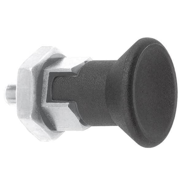Indexing Plunger, Thread Size 5/16 In.-24, Thread Length 6 mm, Nose Shape Pin, Plunger Material Stainless Steel, Plunger Dia. 4.00mm, Plunger Projection 4 mm, Mounting Type Not Applicable, With Locking Plunger Yes, Body Length 25.5 mm, Final Nose Force 12 N, Initial Nose Force 6 N, Overall Length 29.5 mm, Plunger Width 10 mm, Handle Type Mushroom Knob, Body Finish Uncoated, Body Material Stainless Steel, Handle Color Black, Handle Material Thermoplastic, Plunger Finish Uncoated, Retractable Yes