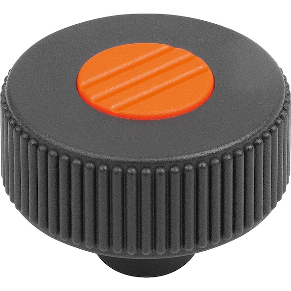 Knurled Knob Size:2, D1=50 D=M08 , Form:K, Plastic Black Ral7021, Comp:Steel, Cap:Orange Ral 2004