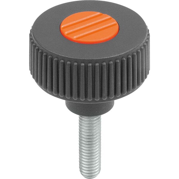 Knurled Knob Size:2, D1=50 D=M08X30, , Form:L, Plastic Black Ral7021, Comp:Stainless, Cap:Orange Ral