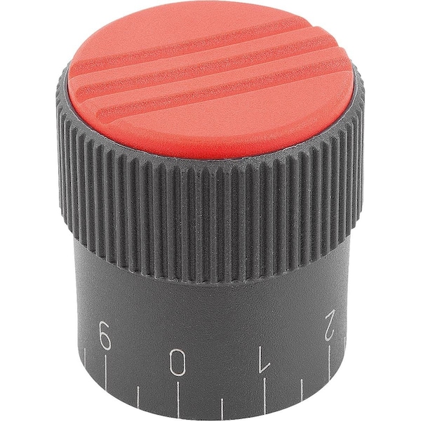 Knurled Knob W.Scale Size:3, D1=34, H=36, D=8, Form:C, Plastic Black, Comp:Steel, Cap:Red