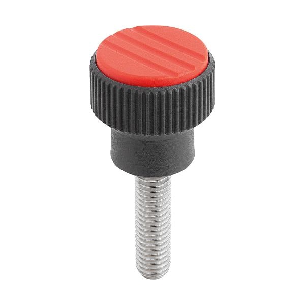 Knurled Knob Size: 1 D=10-32X10 D1=21 H=22 Thermoplastic Black RAL 7021, Components: Stainless Steel, Cap: Red RAL 3020. Note: all KIPP measurements are expressed in millimeters (mm) except for threads and bores on inch products, which are expressed in inches.