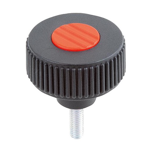 Knurled Knob Size: 1 D1=40 D=M06X20 H=31, Form: L, Thermoplastic Black RAL 7021, Components: Steel, Cap: Red RAL 3020. Note: all KIPP measurements are expressed in millimeters (mm) except for threads and bores on inch products, which are expressed in inches.