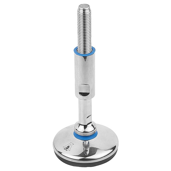 Male-End Leveling Mount, Leveling Mount Type Swiveling Stud, Base Dia. 60 mm, Height 191 mm, Load Capacity 10 kN, Thread Size M16, Construction 304 Stainless Steel w/Silicone Seal, Connection Type Threaded Stud, Bolt Length 79 mm, Finish Polished, Base Material Rubber, Bolt Material Stainless Steel, Swivel Angle 15 Degrees , Base Shape Round, FDA 3-A Standard Compliance FDA 3-A Standard Compliant, Base Thickness 23 mm, Base Nitrile, Socket Material Not Applicable