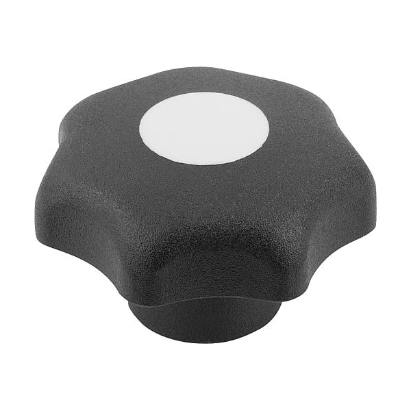 Star Grip, DIN 6336 Similar, D=6, D1= 32, Drilled Bushing, Steel, Black Plastic, Cap: Gray