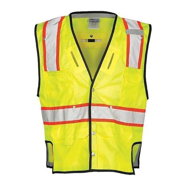 High-Visibility Vest, ANSI Class 2, Vest Size 2XL, 3XL, Traffic Safety Vest Color Yellow/Green, Fits Chest Size 50 in, Gender Men's, Stripe Color Silver, Vest Material Polyester, Vest Closure Type Snap, Vest Stripe Color Family Silver, Back Stripe Pattern U, Vest Length 29 in, Number of Pockets (Inside) 2, Number of Pockets (Outside) 4, Number of Pockets with Closure 3, Features Back and Side Openings for Harness Rings, Left Chest Mic Tab, Standards ANSI/ISEA 107