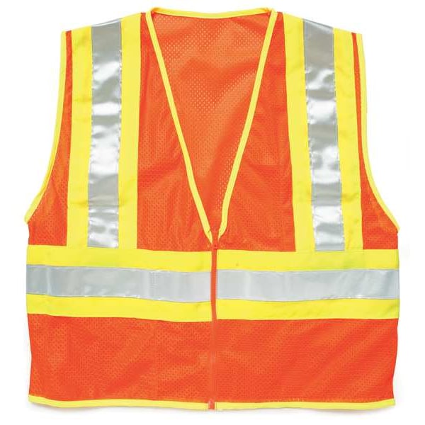High Visibility Vest, ANSI Class 2, Vest Size L, Traffic Safety Vest Color Orange/Red, Fits Chest Size 44 in to 46 in, Gender Men's, Stripe Color Lime/Silver, Vest Material Polyester, Vest Closure Type Zipper, ATPV Rating Not Rated, Vest Stripe Color Family Silver, Back Stripe Pattern U, Vest Length 24 in, Number of Pockets (Inside) 1, Number of Pockets (Outside) 1, Number of Pockets with Closure 0, Features Left Chest Mic Tab, Standards ANSI/ISEA 107
