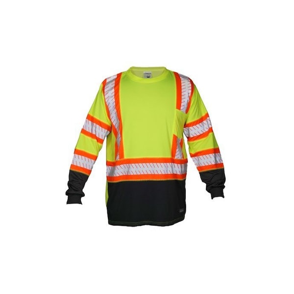 T-Shirt, Gender Unisex, ANSI Class 3, Shirt Style T-Shirt, Back Stripe Pattern U, Material 12 Percent Spandex, 88 Percent Polyester, Number of Outside Pockets 1, Front Closure Type Not Applicable, Collar Style Not Applicable, Color Black/Lime, Size XL, Size-Body Type Regular, Fabric Weight 0.75 oz/sq yd, Reflective Tape Type Glass Bead, Reflective Stripe Border Type Contrasting, Garment Features Black Bottom, Standards ANSI 107, Sleeve Type Long, Maximum Chest Size 44 in, ANSI Type R