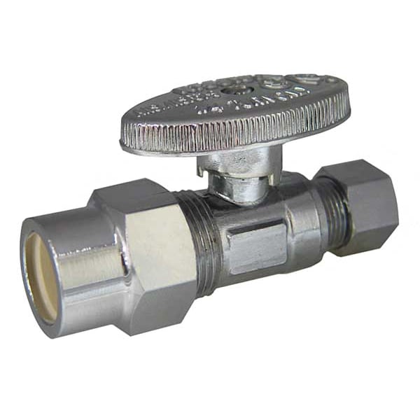 Water Supply Stop, Handle Operation 1/4-Turn, Body Material Brass, Body Finish Chrome-Plated, Connection Size - Side 1 1/2 in, Connection Gender - Side 1 Female, Connection Size - Side 2 3/8 in, Connection Gender - Side 2 Female, Connection Type - Side 2 Compression, Connection Size - Side 3 Not Applicable, Connection Gender - Side 3 Not Applicable, Connection Type - Side 3 Not Applicable, Maximum Pressure - Operating 125 psi, Operating Temperature - Minimum 40 Degrees F