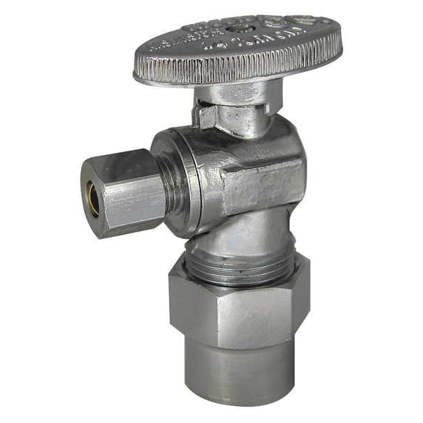Water Supply Stop, Handle Operation 1/4-Turn, Body Material Brass, Body Finish Chrome-Plated, Connection Size - Side 1 1/2 in, Connection Gender - Side 1 Female, Connection Size - Side 2 1/4 in, Connection Gender - Side 2 Female, Connection Type - Side 2 Compression, Connection Size - Side 3 Not Applicable, Connection Gender - Side 3 Not Applicable, Connection Type - Side 3 Not Applicable, Maximum Pressure - Operating 250 psi, Operating Temperature - Minimum 40 Degrees F