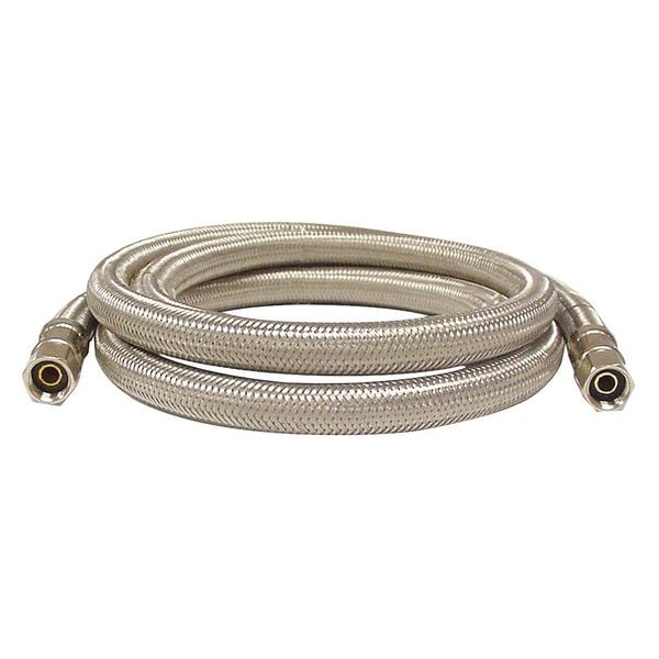 Supply Line, Hose Inside Dia. 1/8 in, Hose Length 10 ft, Hose Tube Material PVC, Hose Cover Material Stainless Steel, Max. Working Pressure @ 70 F 250 psi, Temp. Range 40 Degrees to 180 Degrees F, Standards IAPMO, NSF, UPC, Hose Fitting A Material Brass, Hose Fitting B Material Brass, Hose Fitting A Type F Compression, Hose Fitting B Type FIP, Hose Fitting A Size 1/4 in, Hose Fitting B Size 1/4 in, Hose Configuration Bulk Hose, For Use With Ice Maker, Application Ice Machine