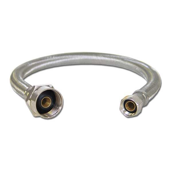 Toilet Connector, Hose Inside Dia. 5/16 in, Hose Length 12 in, Hose Tube Material PVC, Hose Cover Material Stainless Steel, Max. Working Pressure @ 70 F 250 psi, Temp. Range 40 Degrees to 180 Degrees F, Standards IAPMO, NSF, Hose Fitting A Material Brass, Hose Fitting B Material Brass, Hose Fitting A Type F Compression, Hose Fitting B Type FIP, Hose Fitting A Size 3/8 in, Hose Fitting B Size 7/8 in, Hose Configuration Bulk Hose, For Use With Toilet, Application Toilet