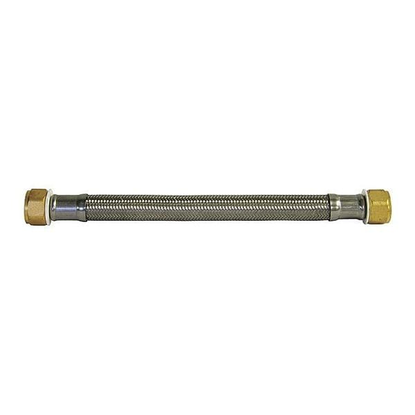 Water Heater Connector, Hose Inside Dia. 5/16 in, Hose Length 18 in, Hose Tube Material PVC, Hose Cover Material Stainless Steel, Max. Working Pressure @ 70 F 250 psi, Temp. Range 40 Degrees to 180 Degrees F, Standards IAPMO, NSF, Hose Fitting A Material Brass, Hose Fitting B Material Brass, Hose Fitting A Type F Compression, Hose Fitting B Type FIP, Hose Fitting A Size 3/4 in, Hose Fitting B Size 3/4 in, Hose Configuration Bulk Hose, For Use With Water Heater, Application Water Heater