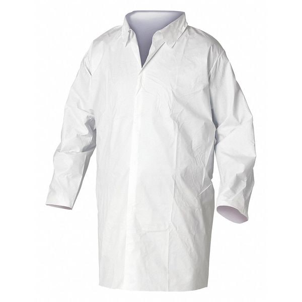 Lab Coat, Anti-Static Yes, Attached Hood No, Closure Type Snaps, Collar Style Mandarin, Color White, Cuff Style Elastic, Features Below-the-Knee-Length, Gender Unisex, Hazard Type Non-Hazardous Dry Particulates, Launderable No, Material SMMMS, Named Size L, Number of Pockets 0, Packaging Individually Packaged, Pattern Solid, Pocket Location Not Applicable, Product Type Lab Frock, Seam Style Serged, Package Quantity 30