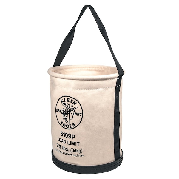 Bucket Bag, Bag Material Canvas, Bag Type Straight Wall, Body Color Black, Bottom Diameter 12 in, Closure Type Open Top, Features Chemical-Resistant, Attachment Type Not Applicable, Material Weight 2.1 lb, Number of Inside Pockets 1, Number of Outside Pockets 0, Number of Pockets 1, Overall Height 15 in, Reinforced Bottom Reinforced Bottom Included, Shape Round, Top Diameter 12 in, Total Load Capacity 75 lb, Includes Hang Strap Hang Strap Not Included