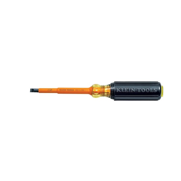 If you are looking for a screwdriver that can handle tough jobs, the Klein Tools 602-4-INS Insulated Screwdriver Slotted 1/4" 4 in Round is what you need. It has a 1000V rating, so it can be used on high voltage appliances and equipment. This insulated slotted screwdriver has a black oxide tip finish to protect against corrosion. The overall length of this screwdriver is 8 1/4 in., while its shank length is 4 in. with an alloy steel shank material. It also features a cabinet tip style screwdriver tip and cushion grip handle design. The Klein Tools 602-4-INS Insulated Screwdriver Slotted 1/4" 4 in Round offers you excellent performance with its durable construction and insulation technology.
