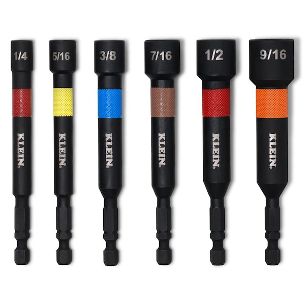 Klein Tools 4-Inch Power Nut Setter 6-Piece Set features a compact 4-Inch length for use in tight spaces. Color-coded bands allow quick and easy size identification. A strong magnet securely holds fasteners for efficient, one-handed driving. Built for high-torque impact drivers. Powerful magnet secures connection to fasteners. Easy-to-hold, color-coded hex for fast identification.