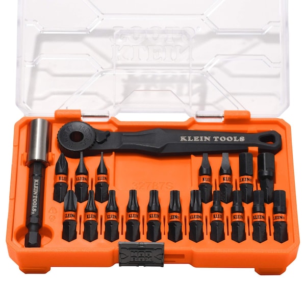 The Slim Micro-Ratchet ProFlex Impact Bit Set features a low-profile ratchet to access hard-to-reach fasteners. Set also includes 18 ProFlex bits and a strong magnetic bit holder to firmly hold fasteners for one-handed driving. The ultra-slim case allows compact storage and has an extending back latch to connect to larger Klein Tools cases. Secure-pivot bit storage makes bit access simple while preventing bits from accidentally falling and being misplaced. Slim head fits into confined spaces for precise fastening. ProFlex torsion zones reduce stress and extend bit life. Back latch extends to connect to larger Klein Tools MODbox cases. Stainless steel bit holder contains powerful Rare-Earth magnet for securing bits and fasteners.